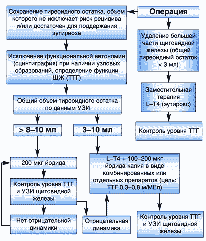 Рис. 2. Лечение диффузного эутиреоидного зоба Существенным недостатком монотерапии L–тироксином является феномен отмены – рецидив зоба после отмены препарата. Основным же плюсом комбинированного назначения йода и L–тироксина является более быстрое (по сравнению с монотерапией йодом) достижение уменьшения объема щитовидной железы (за счет левотироксина) и нивелировка феномена отмены L–T4 (рецидив зоба) за счет йода. Препараты йода и профилактика послеоперационного рецидива зоба Если речь идет о диффузном эутиреоидном зобе, операция может быть показана лишь при его гигантском размере и/или при явлениях компрессии окружающих органов. В случае многоузлового и узлового зоба, в ситуациях, когда при помощи тонкоигольной биопсии исключена опухолевая природа этих образований, показанием для операции является лишь значительный размер узлов (более 4–5 см в диаметре). Отсутствие в нашей стране единых подходов к оперативному лечению заболеваний щитовидной железы, приводит к тому, что эндокринологи сталкиваются с пациентами, которым в одинаковых клинических ситуациях предпринимаются совершенно разные по объему операции. Наибольшие возражения вызывают операции, подразумевающие удаление (энуклеацию) отдельных узловых образований. Оставляет желать лучшего и огромное количество не обоснованных оперативных вмешательств по поводу банального узлового и многоузлового коллоидного зоба. Разбирая принципы профилактического лечения после операций по поводу различных вариантов йододефицитного зоба, прежде всего, следует отметить, что такая профилактика необходима. На это указывает тот факт, что риск послеоперационного рецидива зоба достаточно высок и варьирует от 20 до 80%. Ориентировочный алгоритм послеоперационной профилактики представлен на рисунке 3.