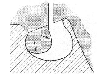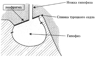 Рис 2. Пролабирование супраселлярной цистерны в полость турецкого седла (ПТС) [41] Этиология и патогенез ПТС Паутинная оболочка пролабирует в полость турецкого седла через отверстие в диафрагме в том случае, если размер последнего превышает 5 мм [22,25,34,41]. Недостаточность диафрагмы является обязательным условием формирования ПТС. В настоящее время известен широкий спектр патологических и физиологических факторов, способствующих развитию «пустого» турецкого седла: – повышение внутричерепного давления вследствие легочно–сердечной недостаточности, артериальной гипертензии, черепно–мозговой травмы; – локальное повышение давления в желудочках при опухолях головного мозга, тромбозе синусов; – физиологические процессы (беременность, роды, климакс); – первичная гипофункция периферических эндокринных желез, длительный прием оральных контрацептивов; – арахноидальные кисты, развившиеся в результате оптико–хиазмального арахноидита; – спонтанный некроз аденомы гипофиза, инфаркт гипофиза; – инфекционные заболевания с тяжелым течением (менингит, геморрагическая лихорадка); – аутоиммунные заболевания (аутоиммунный тиреоидит, болезнь Шегрена, лимфоцитарный аденогипофизит); – наследственная неполноценность соединительной ткани (наличие ПТС у родителей и детей). Таким образом, установлено, что для формирования «пустого» турецкого седла необходимо два условия: недостаточность диафрагмы и внутричерепная гипертензия, остальные факторы лишь способствуют его развитию [1,20,22,29,34]. Клиника синдрома ПТС Клиническая картина отличается динамичностью, сменяемостью одного синдрома другим, спонтанными ремиссиями [2,3,22,]. Чаще болеют женщины (4/5) в возрасте от 35 до 55 лет. Около 75% больных страдают ожирением [13,22,29,36]. Самым частым симптомом является головная боль (80–90%), не имеющая четкой локализации и варьирующая от легкой до нестерпимой, почти постоянной [2,13,8,22,26]. Дисфункция гипоталамуса выражается вегетативными синдромами и вегетативными кризами с ознобом, резким подъемом артериального давления, кардиалгиями, одышкой, чувством страха, болями в животе, в конечностях, подъемом температуры, нередко синкопальными состояниями [2,8,22,32]. Наряду с вегетативными нарушениями больные с синдромом ПТС подвержены эмоционально–личностным и мотивационным расстройствам. Клиническая симптоматика и течение болезни усугубляются в связи с острой или хронической стрессовой ситуацией [3,5]. Эндокринные симптомы при ПТС обусловлены нарушением тропной функции гипофиза, проявляются в виде гипо– или гиперсекреции и варьируют по степени тяжести: от субклинических форм до тяжелых. [1,12,13, 20,22, 24,33]. Per Bjerre отмечает, что гипофизарные нарушения при синдроме ПТС аналогичны изменениям при аденоме гипофиза и часто имеет место сочетание ПТС с микроаденомами [22]. Гипотиреоз, гиперпролактинемия и половые нарушения (снижении потенции, либидо, олиго– и аменорея) наиболее характерны для больных этой группы [21,31,37]. Brismar обнаружил ПТС у больных с болезнью Иценко–Кушинга, Dominique сообщил о наличии ПТС у 10% больных акромегалией [7,13,22,37]. Причиной эндокринных расстройств при ПТС принято считать не компрессию секреторных клеток гипофиза, которые продолжают функционировать даже при значительной гипоплазии, а нарушение гипоталамического контроля над гипофизом в результате затр