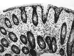 В клинической практике врач нередко сталкивается с обстоятельствами (сомнительные результаты вирусологических и серологических исследований, случаи микст-инфекций), когда возникает необходимость в применении дополнительных методов для верификации диагноза. С этой целью может быть использован доступный для практического здравоохранения интрументальный метод исследования — ректороманоскопия с аспирационной биопсией слизистой оболочки толстой кишки. При гистологическом, морфометрическом и гистохимическом исследованиях биоптатов при ротавирусном гастроэнтерите выявляются характерные изменения в виде поверхностного минимально выраженного катарального колита с незначительной дистрофией эпителия (рис. 1), снижения числа серотонинсодержащих желудочно-кишечных эндокриноцитов (ЕС-клетки) в эпителиальном пласте кишечных желез, умеренной инфильтрацией собственной пластинки плазматическими клетками и увеличением в ней числа макрофагов (рис. 2). Эти особенности имеют дифференциально-диагностическое значение, поскольку отличаются указанным показателем от других острых кишечных инфекций, что может быть использовано в диагностически сложных случаях. Здравоохранение в настоящее время не располагает препаратами, обладающими специфическим антиротавирусным действием, поэтому терапия ротавирусного гастроэнтерита является патогенетической. Основные ее цели — борьба с дегидратацией, токсикозом и связанными с ними наиболее часто встречающимися при ротавирусном гастроэнтерите нарушениями функции жизненно важных органов — сердечно-сосудистой системы и органов мочевыделения, степень выраженности которых во многом определяет тяжесть течения заболевания и его прогноз. Для правильного выбора характера и объема проводимой регидратационной терапии в первую очередь необходимо установить степень дегидратации у того или иного пациента. При эксикозе I — II степени следует ограничиваться пероральной регидратационной терапией (препараты регидрон, глюксолан и др.). При дегидратации III степени целесообразно прибегать к комбинированной парентеральной и пероральной регидратации. Для парентеральной регидратации применяют растворы трисоль, квартасоль, ацесоль и др. С целью дезинтоксикации и улучшения гемодинамики при среднетяжелом и тяжелом течении заболевания показаны коллоидные растворы (гемодез, полиглюкин и др.).