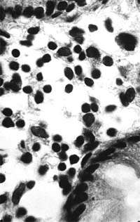 При ротавирусном гастроэнтерите гемограмма изменяется следующим образом: в остром периоде заболевания с высокой частотой выявляются лейкоцитоз с нейтрофилезом и повышенная СОЭ. В периоде реконвалесценции картина крови обычно нормализуется полностью. Изменения урограммы у большинства больных имеют кратковременный характер и проявляются чаще всего небольшой протеин-, лейкоцит- и эритроцитурией; в редких случаях в моче появляются гиалиновые цилиндры в незначительном количестве. При тяжелом течении заболевания нарушения функции почек могут быть более выраженными, с повышением уровня мочевины крови, олигоурией или анурией, снижением клубочковой фильтрации. На фоне проводимой терапии указанные изменения быстро исчезают и при повторных обследованиях не отмечаются. В качестве примера, иллюстрирующего особенности клинического течения ротавирусного гастроэнтерита, приводим выписку из истории болезни. Больная Б., 42 года. Диагноз: ротавирусный гастроэнтерит, средне-тяжелое течение. Заболела остро, заболевание началось с появления тошноты, слабости, пропал аппетит; слабость нарастала, появились сильный озноб, ломота в теле, «как при гриппе», постепенно повысилась температура — сначала 37,5°С, а затем до 38,4°С. Диарея развилась примерно через 10 часов от начала заболевания; стул жидкий, сначала кашицеобразный, затем водянистый, без патологических примесей. Боли в животе незначительные, диффузные, усиленная перистальтика, громкое урчание. Жалобы на резкую слабость, громкое урчание в животе, умеренные боли ноющего характера в животе, в области пупка; стул обильный, водянистый, желто-зеленого цвета, без патологических примесей, до 10 раз в день. При осмотре отмечены бледность кожи, гиперемия зева. Тоны сердца при аускультации приглушены, тахикардия до 36 ударов в минуту, АД 130/90 мм рт. ст. Живот мягкий, болезненный при пальпации в околопупочной области. Гемограмма на первый-второй день болезни: Hb 135 г/л, л. 8,4х109/л, п. 2%, с. 83%, л. 9%, м. 6%, СОЭ 14 мм/ч. Урограмма: относительная плотность 1,025, лейкоциты — 6—8 в поле зрения. Лечение: обильное питье солевых растворов, парентеральная регидратационная и дезинтоксикационная терапия — трисоль 1000 мл внутривенное капельное введение, внутрь ферментные препараты: абомин, панкреатин, тансол, карболен. Течение заболевания без осложнений. На третий день болезни — субфебрильная температура, оставалась слабость; боли в животе прекратились. Стул кашицеобразный до пятого дня от начала заболевания. Полное выздоровление наступило на седьмой день болезни. Результаты бактериологических и серологических исследований на бактерии — возбудители острых кишечных инфекций отрицательные. Диагноз ротавирусного гастроэнтерита подтвержден обнаружением ротавирусов в фекалиях на второй день болезни методом прямой электронной микроскопии и выявлением ротавирусного антигена реакцией латекс-агглютинации с использованием набора «Роталекс». Дифференциальный диагноз у больных ротавирусным гастроэнтеритом проводят с другими острыми кишечными инфекциями как вирусной так и бактериальной этиологии, прежде всего в тех случаях, когда в клинической картине на первый план выступает синдром гастроэнтерита: с вирусными диареями различной этиологии (аденовирусы, коронавирусы, астровирусы, калицивирусы, вирус Норфолк, энтер