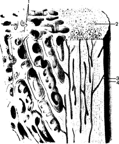 Кость имеет сложное строение и химический состав. В живом организме кость содержит 50% воды, 28,15% органических веществ, в том числе 15,75% жира, и 21,85% неорганических веществ, представленных соединениями кальция, фосфора, магния и других элементов. Обезжиренная, отбеленная и высушенная кость (мацерированная) на '/з состоит из органических веществ, получивших название "оссеин", и на 2/з из неорганических веществ. Прочность кости (механические свойства) обеспечивается физико-химическим единством органических и неорганических веществ, а также конструкцией костной ткани. По прочности кость сравнивают с некоторыми металлами (медь, железо). Преобладание в кости органических веществ (у детей) обеспечивает ей большую упругость, эластичность. При изменении соотношения в сторону преобладания неорганических веществ кость становится ломкой, хрупкой (у стариков). Наружный слой кости представлен толстой (в диафизах трубчатых костей) или тонкой (в эпифизах трубчатых костей, в губчатых и плоских костях) пластинкой компактного вещества, substantia compacta. Под компактным веществом располагается губчатое (трабекулярное) вещество, substantia spongiosa (trabe-cularis), пористое, построенное из костных балок с ячейками между ними, по виду напоминающее губку. Рисунок строения кости хорошо виден на срезах (шлифах) костей. Внутри диафиза трубчатых костей находится костномозговая полость, cavitas medullaris, содержащая костный мозг. Компактное вещество построено из пластинчатой костной ткани и пронизано системой тонких питательных канальцев, одни из которых ориентированы параллельно поверхности кости, а в трубчатых костях - вдоль длинного их размера (центральный, или гаверсов, канал), другие, прободающие (каналы Фолькмана) – перпендикулярно поверхности. Эти костные канальцы служат продолжением более крупных питательных каналов, candles nutrlcii (nutriensii), открывающихся на поверхности кости в виде отверстий, один - два из которых бывают довольно крупными. Через питательные отверстия в кость, в систему ее костных канальцев проникают артерия, нерв и выходит вена. Стенками центральных каналов служат концентрически расположенные костные пластинки в виде тонких трубочек, вставленных одна в другую. Центральный канал с системой концентрических пластинок является структурной единицей кости получил название остеона, или гаверсовой системы. Пространства между остеонами выполнены вставочными промежуточными, интерстициальными) пластинками. Наружный слой компактного вещества кости образован наружными окружающими пластинками. Внутренний слой кости, ограничивающий костномозговую полость и покрытый эндостом, представлен внутренними окружающими пластинками. Остеоны и вставочные пластинки образуют компактное корковое вещество кости. Кроме суставных поверхностей, покрытых хрящом, снаружи кость покрыта надкостницей, periosteum. Надкостница тонкая прочная соединительнотканная пластинка, которая богата кровеносными и лимфатическими сосудами, нервами. В ней можно выделить два слоя. Наружный слой надкостницы – волокнистый, внутренний - ростковый, камбиальный (остеогенный, костеобразующий), прилежит непосредственно к костной ткани. 3а счет внутреннего слоя надкостницы образуются молодые костные клетки (остеобласты), откладывающиеся на поверхности кости. Таким образом, вследствие костеобразующих 