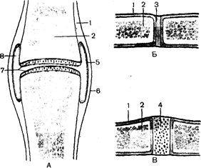 Виды соединений костей (схема). А-сустав. Б-синдесмоз. В-синхондроз. Г-симфиз (гемиартроз). 1 - надкостница; 2 - кость; 3 - волокнистая соединительная ткань; 4 - хрящ; 5 - синовиальная мембрана; 6- фиброзная мембрана; 7 - суставной хрящ; 8-суставная полость; 9-щель в межлобковом диске; 10-межлобковый диск.