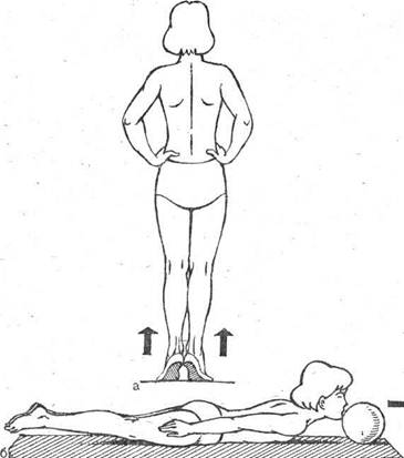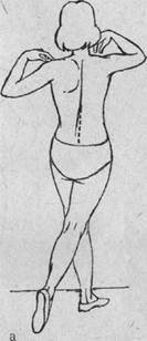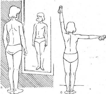 Рис. 1.1. Корригирующие упражнения. а — активная коррекция — выравнивание позвоночника к треугольников талии; б—корригирующие упражнения с гантелями