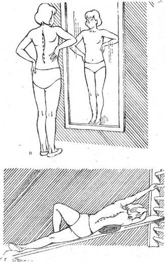 Рис. 1.3. Продолжение. в—вис на гимнастической стенке; г — потягивание вверх, стоя на гимнастической палке. Глава 3.2 Примерные комплексы упражнений для больного сколиозомКомплекс 1. Упражнения для формирования и закрепления навыка правильной осанки Исходная позиция –– стоя. 1. Принятие правильной осанки за счет касания стены или гимнастической стенки ягодичной областью, икроножными мышцами и пятками. Отойти от стены на 1—2 шага, сохраняя правильную осанку. Исходная позиция –– лежа на спине, руки вдоль туловища. 2. Голова, туловище, ноги составляют прямую линию. Приподнять голову и плечи, вернуться в исходную позицию. 3. В правильном положении прижать поясничную область к полу. Встать, принять правильную осанку. Комплекс 2. Упражнения для укрепления «мышечного корсета» Для мышц спины: Исходная позиция ––лежа на животе, подбородок на тыльной поверхности кистей, положенных одна на другую. 1. Перевести руки на пояс, приподнимая голову и плечи, лопатки соединить, живот не поднимать, удерживать принятое положение, 2. Приподнимая голову и плечи, медленно перевести руки вверх, в стороны, к плечам. 3. Поднять голову и плечи; руки, в стороны; сжимать и разжимать кисти рук. 4. Поочередное поднимание прямых ног, не отрывая таза от пола. Темп медленный. 5. Приподнимание обеих прямых ног с удержанием 10—15 с. Для мышц брюшного пресса: Исходная позиция ––лежа на спине, поясничная область прижата к опоре. 1. Сгибать и разгибать ноги в коленных и тазобедренных суставах поочередно. 2. Согнуть обе ноги, разогнуть вперед, медленно опустить. 3. Поочередное сгибание и разгибание ног на весу — «велосипед». 4. Руки за головой. Поочередное поднимание прямых ног вперед. То же упражнение в сочетании с различными движениями рук. Симметричные корригирующие упражнения: Исходная позиция — лежа на животе, подбородок на тыльной поверхности кистей, положенных одна на другую, локти разведены в стороны, положениетуловища и ног –– прямое. 1 Поднять руки вверх, тянуться в направлении рук головой, не поднимая подбородка, плеч и туловища; и вернуться в исходную позицию. 2. Сохраняя срединное положение позвоночника, отвести назад прямые руки; ноги, разогнутые в коленных суставах, приподнять — «рыбка». 3. Приподнять голову и грудь, поднять вверх прямые руки, при поднятии –– прямые ноги, сохраняя правильное положение тела, несколько раз качнуться — «лодочка». В качестве симметричных могут быть использована, другие упражнения для укрепления мышц брюшного пресса и спины из и. п. лежа при условии сохранения симметричного положения частей тела относительно оси позвоночника. Асимметричные корригирующие упражнения: 1 Исходная позиция, стоя перед зеркалом, сохраняя правильную осанку, поднять плечо с поворотом его внутрь на стороне вогнутости грудного сколиоза. 2 Исходная позиция, лёжа на животе, руки вверх, держась за рейку гимнастической стенки. Приподнять напряженные ноги и отвести их в сторону выпуклости поясничного сколиоза. 3. Ходьба на гимнастической скамейке с мешочком на голове и отведением ноги в сторону выпуклости поясничного сколиоза. Упражнения для укрепления мышц спины: 1) Исходная позиция –– стоя, руки за головой. С силой отведите руки в стороныи, подняв руки вверх, прогнитесь. Замрите на 2-4 секунды и вернитесь в и.п. Повторите 6-10 раз. Дыхание произвольное. 2) Исходная поз