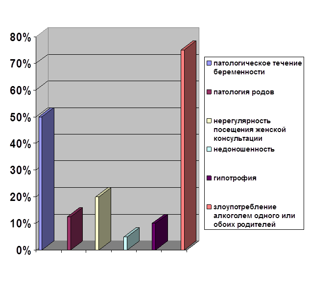 Вывод: I. место занимает злоупотребление алкоголем одного или обоих родителей II. место – патологическое течение беременности III. место -- нерегулярность посещения женской консультации На первом году жизни, когда, благодаря правильному воспитанию и своевременно начатому лечению, можно было бы скорректировать многие нарушения, обусловленные патологией беременности и родов, наблюдаемые нами дети не только не получали необходимой медицинской помощи, но и были лишены элементарного внимания со стороны родителей, оказавшись в чрезвычайно неблагоприятной для их дальнейшего развития социально – психологической обстановке. Таблица3.