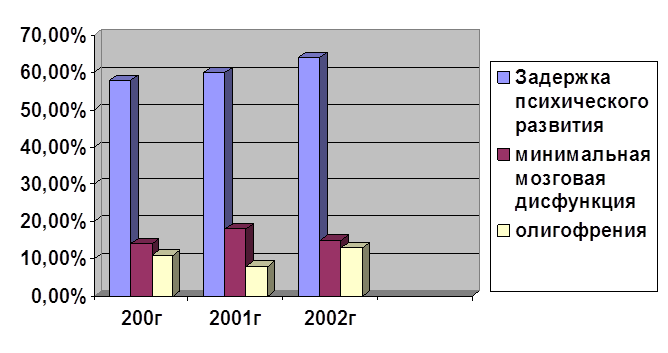 Вывод: за отчетный период дети с 1гр. здоровья в приют не поступали. Как видно из представленных диаграмм, количество детей со 2гр. здоровья постоянно снижается, что связано с общей экономической ситуацией в стране, социальным статусом, который не мог не сказаться на уровне здоровья детей и их родителей. 2гр. составляет в среднем 70 – 76%. 3гр. – 24 – 30% от общего числа детей: дети, имеющие хронические заболевания, функциональные отклонения, с недостаточной массой тела. Число таких детей увеличивается из года в год. Диспансеризация больных детей Диспансеризация-это система работы, в основу которой положены профилактика, раннее выявление заболеваний и комплексное лечение ребенка на всех этапах медицинской помощи. Учитывая специфику учреждения (приют рассчитан на кратковременное пребывание детей, сроком от 1 до 3 –6 месяцев) организация диспансеризации детей с выявленной патологией, с хроническими заболеваниями не представляется возможной или затруднена, т. к проследить и осуществить программу оздоровительных мероприятий нельзя (ребёнок или уходит в семью, или оформляется в дет. дом). Поэтому на каждого ребенка при выявлении заболеваний, требующих диспансерного наблюдения, составляется план мероприятий, даются рекомендации по дальнейшему ведению данного ребёнка, с которыми ребенок выбывает из приюта. Психические нарушения у детей Психические нарушения различной тяжести встречаются у подавляющего большинства детей, находившихся в приюте. Основные нарушения-это задержка психического развития, олигофрения, минимальная мозговая дисфункция. В данной таблице отражена встречаемость психических нарушений у детей в процентах от общего числа детей по годам. Таблица 9.
