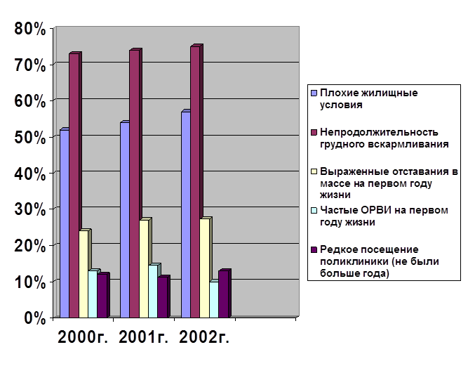 Таким образом, отмечается тенденция к некоторому росту воздействующих неблагоприятных факторов как до рождения ребёнка, так и на первом году жизни, что связано с ухудшением общей социально – экономической обстановки в стране.