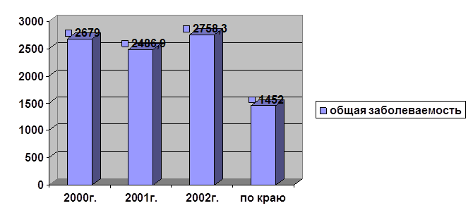 Выводы 1. приют является местом кратковременного пребывания детей, поэтому организация прививочной работы, диспансеризации имеет свои особенности. 2. прослежена прямая зависимость воздействия неблагоприятных социально-бытовых факторов на состояние здоровья детей, отмечается тенденция к возрастанию этих факторов. 3. показатели общей заболеваемости по приюту превышают показатели заболеваемости по краю. 4. в структуре общей заболеваемости на первом месте находятся болезни органов дыхания. 5. в структуре острой заболеваемости основное место занимают ОРЗ. 6. отмечается снижение заболеваемости ОРЗ и гриппом в 2002 году. 7. среди психических нарушений лидирует задержка психического развития. 8. растет число детей, имеющих ухудшенное физическое развитие. 9. отмечается тенденция к уменьшению числа детей со второй группой здоровья и возрастанию с третьей. 10. из года в год растет число тубинфицированных детей, отмечается рост заболеваемости педикулезом, что является отражением общей социально-экономической обстановке в стране. Задачи 1. постоянно повышать свой профессиональный уровень, свою квалификацию. 2. систематически проводить профилактические осмотры детей для раннего выявления отклонений в их здоровье. 3. проводить анализ результатов медицинских осмотров, разрабатывать мероприятия, направленные на укрепление здоровья детей. 4. эффективно проводить лечебные и оздоровительные мероприятия с целью своевременного выявления больных и реабилитации реконвалесцентов острых заболеваний. 5. стремиться к снижению первичной заболеваемости путем улучшения профилактической работы, ранней диагностики, санации хронических очагов инфекции, оздоровления в летних лагерях. 6. постоянно проводить санитарно-просветительную работу. 7. в полном объеме проводить противоэпидемические мероприятия. |