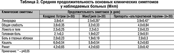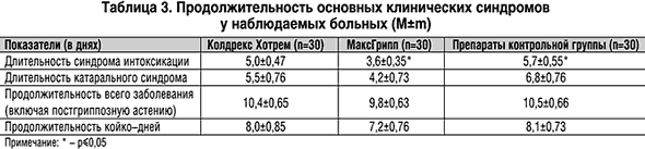 Как видно из таблицы 2, нами было получено достоверное (pЈ0,05) положительное действие препарата МаксГрипп на снижение температурной реакции, а также укорочение болевого синдрома при гриппе и ОРЗ по сравнению с препаратами «альтернативной терапии», что значительно улучшало общее состояние больных уже в первые сутки. Однако у двух пациентов (6% случаев) на фоне приема препарата «МаксГрипп» отмечалось появление диспептических явлений в виде тошноты и чувства тяжести в эпигастрии, а у одного больного (3%) появилась аллергическая сыпь по типу крапивницы. После отмены препарата вышеуказанные изменения полностью проходили. «Колдрекс Хотрем» и препараты контрольной группы проявили сходную степень воздействия на основные клинические синдромы вирусной инфекции. Однако при приеме препаратов контрольной группы у больных отмечалось появление сонливости, вялости, снижение скорости психомоторных реакций и различные холинолитические эффекты (сухость слизистых, тошнота, задержка мочи, сердцебиение), что объясняется содержанием в составе этих лекарственных средств антигистаминного препарата первого поколения – фенирамина. Препараты «Колдрекс Хотрем» и «МаксГрипп» влияния на скорость психомоторных реакций не оказывали и не вызывали сонливости у больных, а включенный в их состав фенилэфрин в дозе 10 мг эффективно восстанавливал носовое дыхание, не вызывая эффекта седации и других побочных реакций. В контрольной группе у двух больных также отмечались явления диспепсии, которые после отмены препаратов полностью проходили. В таблице 3 представлена продолжительность основных клинических синдромов у наблюдаемых больных.
