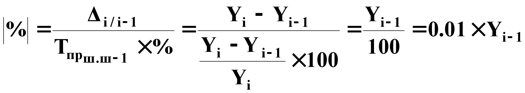 Темп прироста может быть положительным, отрицательным и равным нулю. В статистической практике часто вместо расчета и анализа темпов роста и прироста рассматривают абсолютное значение одного процента прироста. Оно представляет собой одну сотую часть базисного уровня и в то же время – отношение абсолютного прироста к соответствующему темпу прироста: