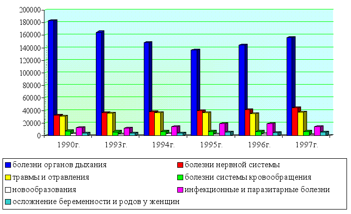 Реферат: Статистический обзор и динамика заболеваемости наиболее важными группами болезней (1990-97гг.) по РСО-АланияРеферат: Статистический обзор и динамика заболеваемости наиболее важными группами болезней (1990-97гг.) по РСО-Аланиявведение Все процессы в биосфере взаимосвязаны. Человечество - лишь незначительная часть биосферы, а человек является лишь одним из видов органической жизни - Homo sapiens (человек разумный). Разум выделил человека из животного мира и дал ему огромное могущество. Человек на протяжении веков стремился не приспособиться к природной среде, а сделать ее удобной для своего существования. Теперь мы осознали, что любая деятельность человека оказывает влияние на окружающую среду, а ухудшение состояния биосферы опасно для всех живых существ, в том числе и для человека. Всестороннее изучение человека, его взаимоотношений с окружающим миром привели к пониманию, что здоровье - это не только отсутствие болезней, но и физическое, психическое и социальное благополучие человека. Здоровье - это капитал, данный нам не только природой от рождения, но и теми условиями, в которых мы живем. В настоящее время хозяйственная деятельность человека все чаще становится основным источником загрязнения биосферы. В природную среду во все больших количествах попадают газообразные, жидкие и твердые отходы производств. Различные химические вещества, находящиеся в отходах, попадая в почву, воздух или воду, переходят по экологическим звеньям из одной цепи в другую, попадая в конце концов в организм человека. Реакции организма на загрязнения зависят от индивидуальных особенностей: возраста, пола, состояния здоровья. Как правило, более уязвимы дети, пожилые и престарелые, больные люди. При систематическом или периодическом поступлении в организм сравнительно небольших количеств токсичных веществ происходит хроническое отравление. Признаками хронического отравления являются нарушение нормального поведения, привычек, а также нейропсихического отклонения: быстрое утомление или чувство постоянной усталости, сонливость или, наоборот, бессонница, апатия, ослабление внимания, рассеянность, забывчивость, сильные колебания настроения. При хроническом отравлении одни и те же вещества у разных людей могут вызывать различные поражения почек, кроветворных органов, нервной системы, печени. Сходные признаки наблюдаются и при радиоактивном загрязнении окружающей среды. Огромный вред здоровью человека наносит курение. Курильщик не только сам вдыхает вредные вещества, но и загрязняет атмосферу, подвергает опасности других людей. Установлено, что люди, находящиеся в одном помещении с курильщиком, вдыхают даже больше вредных веществ, чем он сам. Кроме химических загрязнителей, в природной среде встречаются и биологические, вызывающие у человека различные заболевания. Это болезнетворные микроорганизмы, вирусы, гельминты, простейшие. Они могут находиться в атмосфере, воде, почве, в теле других живых организмов, в том числе и в самом человеке. Часто источником инфекции является почва, в которой постоянно обитают возбудители столбняка, ботулизма, газовой гангрены, некоторых грибковых заболеваний. В организм человека они могут попасть при повреждении кожных покровов, с немытыми продуктами питания, при нарушении правил гигиены. Болезнетворные м