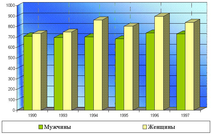 Заболеваемость населения злокачественными новообразованиями, это еще одна актуальная проблема здравоохранения, не только нашей республики и России, но и всего мира. По своей сути злокачественное новообразование это опухоль. Опухолевый рост - местный, автономный, нерегулируемый тканевой рост. В отличие от физиологического ничем не ограничен, не регулируется соответствующими механизмами пораженного организма, имеет процессуальный характер, т.е. развивается во времени. Злокачественно перерожденные клетки удерживают свои свойства и передают их последующим генерациям. Опухоль - это патологический процесс, характеризующийся безудержным размножением клеточных элементов без явлений их созревания. Опухоль – типический патологический процесс представляющий собой нерегулируемое, беспредельное разрастание ткани, не связанное с общей структурой пораженного органа и его функциями. Именно это заболевание поразило 1442 человека в 1990 году (таблица 1.4). За исследуемый нами период (1990-1997гг.) число заболевших, как уменьшалось так и увеличивалось. В 1996 году оно достигло своего максимума и составило 1635 человек. К 1997 году оно снизилось на 69 заболевших, но как мы уже отметили показатель заболеваемости весьма неустойчив, поэтому что-либо спрогнозировать на последующие годы трудно. По таблице 1.5, мы также можем проследить динамику заболеваемости новообразованиями, по отдельным локализациям, как у мужчин, так и у женщин. Видно, что во все годы количество пораженных опухолью женщин больше, чем – мужчин. Можно заметить, что в 1990 году наибольшее количество заболевших было в категории опухолей трахеи, бронхов, легкого – 195 человек (162 мужчины, 33 женщины), а в категориях опухолей печени и внутри печеночных желчных протоков, поджелудочной железы и почек заболевших зарегистрировано не было. К 1997 году заболеваемости в этих категориях увеличились, так например число опухолей поджелудочной железы к 1997 году составило 34. Вообще же заболеваемости мужчин и женщин злокачественными новообразованиями разделились следующим образом: в 1990 году заболевших женщин было 733, в то время как из мужчин заболели 709 человек. И во всех последующих годах женская заболеваемость превышала мужскую, и не на 24 человека, как в 1990 году, а на 50 и более. Так, самый большой перевес был в 1994 и в 1996 годах и составил 161 заболевшего. Мы можем проследить это по рисунку 1.3. Самое же большое количество женщин страдают от опухолей молочной железы, так в 1990 году было зарегистрировано 138 случаев опухолей женской молочной железы, с годами этот показатель вырос своего пика он достиг в 1996 году и составил 229 зарегистрированных случаев. Опухоли трахеи, бронхов и легкого поразили самое большое количество мужчин, скорее всего это связано с тем, что среди мужчин большее число курильщиков. Трудно что-либо спрогнозировать по этому поводу, т.к. показатели заболеваемости злокачественными новообразованиями весьма неустойчивы, за несколько лет они могут, то резко вырасти, то вновь упасть.