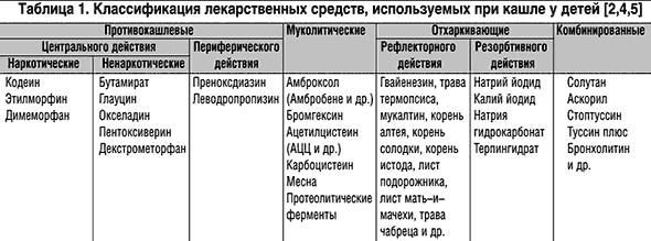 Реферат: Тактика выбора и особенности применения противокашлевых, отхаркивающих и муколитических лекарственных средствРеферат: Тактика выбора и особенности применения противокашлевых, отхаркивающих и муколитических лекарственных средствв педиатрической практике Профессор И.Н. Захарова, профессор Н.А. Коровина, д.м.н. А.Л. Заплатников РМАПО Кашель – рефлекторная, защитно–приспособительная реакция организма, направленная на выведение из дыхательных путей инородных веществ и/или патологически измененного трахеобронхиального секрета. Раздражение чувствительных окончаний n.vagus, расположенных в органах дыхания, приводит к передаче нервных импульсов в кашлевой центр продолговатого мозга. В результате возбуждения кашлевого центра формируется ответная реакция – глубокий вдох, а затем синхронное сокращение мышц гортани, бронхов, грудной клетки, живота и диафрагмы при закрытой голосовой щели с последующим ее открытием и коротким, форсированным толчкообразным выдохом [4,8,9]. Следует отметить, что в физиологических условиях кашель играет лишь вспомогательную роль в процессах очищения дыхательных путей, т.к. основными механизмами санации являются мукоцилиарный клиренс и перистальтика мелких бронхов [8,12,13]. Мукоцилиарный клиренс обеспечивается адекватной работой мерцательного эпителия слизистых, реснички которого постоянными колебательными движениями «выталкивают» слизь из воздухоносных путей в проксимальном направлении. При этом скорость выведения трахеобронхиальной слизи из нижних дыхательных путей зависит не только от функциональной активности мерцательного эпителия, но и от реологических свойств самого секрета. Так, если в нормальных условиях трахеобронхиальная слизь характеризуется низкой вязкостью и хорошей текучестью, то при развитии воспалительных процессов отмечается значительное ухудшение ее реологических параметров и, как следствие, – затрудненное выведение. Причиной этого является изменение качественного состава слизи при воспалении (увеличение концентрации нейтральных и кислых гликопротеинов и др.). В результате уменьшения содержания в составе слизи воды и увеличения концентрации муцинов, слизь становится вязкой, что значительно ухудшает ее текучесть. Одновременно отмечается гиперпродукция слизи. Кроме этого в результате воспаления развиваются функциональные или структурные нарушения мерцательного эпителия, что приводит к снижению мукоцилиарной активности. Все это обуславливает неадекватный мукоцилиарный клиренс и способствует накоплению мокроты [4,10,11]. В этих условиях кашель становится единственным эффективным механизмом санации трахеобронхиального дерева [8]. Таким образом появление у ребенка кашля должно рассматриваться как проявление несостоятельности физиологических механизмов санации трахеобронхиального дерева. При этом наиболее частыми причинами кашля являются патологические изменения в органах дыхания (воспаление, инородное тело и др.). Однако в ряде случаев кашель может быть связан с заболеваниями других органов и систем (центральной нервной системы, органов средостения и др.). Так, при патологическом возбуждении кашлевого центра в ЦНС развивается кашель центрального генеза. В ряде случаев кашель может отмечаться при невротических реакциях, психо–эмоциональном