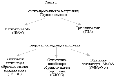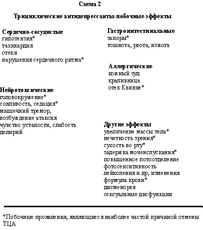 Медикаментозное лечение депрессий проводится, как правило, с помощью антидепрессантов (тимолептиков). Препараты этого класса нормализуют патологически измененный аффект, а также уменьшают обусловленные депрессией идеомоторные и соматовегетативные нарушения; некоторые из них обладают седативными и гипнотическими свойствами. При рассмотрении клинических показаний к применению антидепрессантов следует помнить, что в пределах этого класса психотропных средств выделяются две группы: 1) антидепрессанты первого поколения; 2) тимолептики второго и последующих поколений (схема 1). Первую группу образуют необратимые ингибиторы МАО3 и трициклические антидепрессанты (ТЦА). Большинство ТЦА (амитриптилин – триптизол, нортриптилин – помелор, имипрамин – мелипрамин, кломипрамин – анафранил, дибензепин – поверил и др.) обладают универсальной активностью (воздействие на широкий спектр депрессий – от тяжелых до субсиндромальных). Несмотря на то что их применение сопровождается побочными действиями (схема 2), в ряде случаев препятствующими продолжению лечения, ТЦА можно рассматривать как наиболее хорошо исследованные и надежные средства терапии депрессий 4. Во вторую группу входят препараты иной химической структуры, разработанные в отличие от ТЦА эмпирическим путем, с учетом современных представлений о патогенезе депрессивных расстройств. К их числу относятся селективные ингибиторы обратного захвата норадреналина (СИОЗН: мапротилин – лудиомил, миансерин – леривон и др.; селективные ингибиторы обратного захвата серотонина (СИОЗО: флуоксетин – прозак, пароксетин – паксил, сертралин – золофт, флувоксамин – феварин; обратимые ингибиторы МАО-А (ОИМАО-А): моклобемид – аурорикс, брофаромин – гуморил, метралиндол – инказан, перлиндол – пиразидол. Препараты этой группы, обладающие избирательной психотропной активностью (воздействие на неглубокие – легкой и средней тяжести депрессии) по эффективности сопоставимы с антидепрессантами первого поколения. При этом их отличает меньшая выраженность побочных проявлений и, следовательно, хорошая переносимость. Однако дифференциация антидепрессантов по химической структуре или фармакодинамическим свойствам еще не позволяет обосновать клинические показания к их применению. Среди существующих клинико-терапевтических концепций в качестве приоритетных и перспективных прежде всего для общемедицинской практики выделяется концепция “идеального” антидепрессанта. Эта концепция в отличие от традиционных, позволяющих оценить исключительно психотропную активность препарата (концепции симптомов-мишеней, валентности и спектра психотропных средств), расширяет возможности выбора терапии с учетом не только собственно антидепрессивного действия медикамента. Эти свойства “идеального” антидепрессанта (простота схемы лечения, безопасность передозировки и др.) представлены на схеме 3. К числу других не менее важных свойств антидепрессантов, применяемых в общей медицине, должно относиться отсутствие у избранного препарата способности вызывать лекарственную зависимость, а также синдром отмены, не позволяющих прекратить терапию даже по достижении прямого лечебного эффекта. В наибольшей степени таким теоретическим требованиям удовлетворяют антидепрессанты второй группы (современ