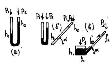 Рис. 1.2 Манометры. Если жидкость с удельным весом g = r∙g (где, r - ее плотность, а g – ускорение свободного падения) занимает положения h1 и h2 при давлениях в коленах p1 и р2 (Рис.1.2.,а), то В случае наклонных трубок (под углом a) U -образного манометра (Рис.1.2, б)