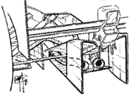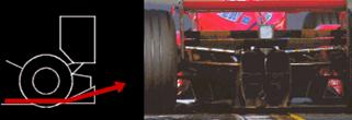 Рис. 2.10 Диффузор. На самом деле принцип действия диффузора прямопротивоположен принципу действия антикрыла: вместо того, чтобы отталкивать воздух, диффузор засасывает его. Эффект этот получается из-за аэродинамической формы. Диффузор находится в самой нижней, "хвостовой" части болида, прямо под задним антикрылом, и объем диффузора увеличивается по мере приближения его к "концу" болида (см. верхний Рис. 2.10). Воздух, попадающий в диффузор из-под дна болида разрежается, за счет попадания его в увеличенный объем диффузора, отсюда и эффект засасывания. Диффузор состоит из большого количества всеразличных "тонельчиков" и "разделителей", которые аккуратно и очень точно контролируют потоки воздуха для лучшего засасывания. Так как диффузор находится в зоне выхлопных газов и заднего рычага подвески, то это накладывает жесткие требования на его конструкцию, в противном случае (при некорректном создании и регулировках диффузора) при изменении скорости выхлопные газы будут влиять на аэродинамический баланс болида. Появление диффузоров обусловлено запретом FIA поднимать "хвостовую" часть болида. В этом случае невозможно обеспечить нужный аэродинамический эффект без диффузоров. 2.3. Боковые дефлекторы.Боковые дефлекторы разделяют и направляют воздух от передних колес на две части – одна направляется на охлаждение двигателя в воздухозаборники, вторая направляется наружу. Это приспособление было впервые применено в 1993 году. Без них набегающий поток воздуха будет идти прямо, и, соответственно, давить на заднюю стенку воздухозаборника, создавая лобовое сопротивление. Дефлектор же (если рассмотреть для примера левый относительно гонщика воздухозаборник) закручивает поток против часовой стрелки (глядя спереди), причем, когда поток входит внутрь водухозаборника, то он уже направлен внутрь болида, т.е. на охлаждаемую поверхность. Таким образом, с помощью боковых дефлекторов достигается две цели: снижение лобового сопротивления и более эффективное охлаждение. Устанавливаются они, как правило, между передними колесами и боковыми понтами болида (см. Рис. 2.11).