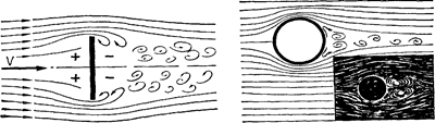 Рис. 1.9 Аэродинамический спектр плоской пластинки и шара. Может быть, шар - идеально обтекаемая поверхность? Нет! Действительно, сначала воздух легко обтекает закругленную поверхность шара. Но когда воздушный поток минует точку, где шар имеет максимальный радиус, ему придется следовать за стремительно сходящейся поверхностью. Для воздуха эта задача более трудная, и вскоре воздушный поток будет уже не в состоянии следовать за поверхностью и оторвется от нее, вызывая турбулентные завихрения. Турбулентные завихрения беспорядочно движутся с обратной стороны шара. Давление турбулентного воздуха ниже, чем окружающего спокойного, и поэтому возникает сила всасывания, действующая в обратном относительно движения шара направлении и тормозящая его. Симметричное каплеобразное тело (Рис. 1.10), имеет более плавный характер обтекания, как в передней, так и в хвостовой частях.