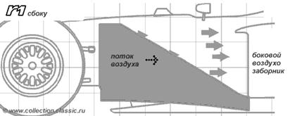 Рис. 2.12 Воздушные потоки на боковых дефлекторах. В сравнении с предыдущим поколением боковых панелей, новый дизайн является гораздо более сложным и тонким. На Рис. 2.11 изображена конструкция, которая использовалась McLaren в 1993 году. В то время боковые панели представляли собой тонкие ровные поверхности в форме прямоугольника, но сейчас, после эволюции, они представляют собой гораздо более сложные разновидности. Теперь они приобрели некоторый объем и особые очертания, чтобы направлять воздушный поток в различных направлениях. Именно все эти, перечисленные выше, элементы конструкции играют важную роль в организации аэродинамического пакета болида. 2.4. Воздухозаборник.Воздух, необходимый для работы двигателя, забирается из отверстия прямо над шлемом пилота. На размер этого отверстия ограничений нет, но при чрезмерно большом отверстии сильно возрастает тормозящий эффект.
