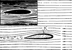 Рис. 1.11 Аэродинамический спектр несимметричного каплеобразного тела (профиля крыла). Здесь имеет место так называемое несимметричное обтекание. Наибольшая деформация струек наблюдается там, где тело имеет наибольшую величину искривления поверхности (точка К). В районе этой точки струйки поджимаются, поперечное сечение их уменьшается. На нижней, менее искривленной поверхности деформация потока будет меньше. На верхней поверхности тела, в месте наибольшего поджатия струек, согласно закону неразрывности (закону постоянства секундных объемов) будет наблюдаться местное увеличение скорости потока и, следовательно, уменьшение давления. На нижней поверхности деформация потока будет меньше и, следовательно, меньше изменение скорости и давления. При обтекании воздушным потоком симметричных (и несимметричных) каплеобразных тел, помещенных под некоторым углом a (углом атаки) к вектору скорости невозмущенного потока (Рис. 1.12), также будем иметь картину несимметричного обтекания и получим аэродинамический спектр, аналогичный тому, что получается при обтекании несимметричного каплеобразного тела (см. Рис. ).