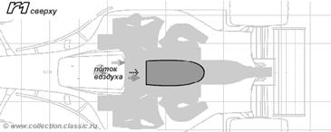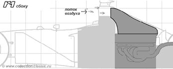 Рис. 2.11 Боковые дефлекторы. Боковые дефлекторы выглядят несколько лишними, но на самом деле являются важной частью аэродинамического пакета. Они расположены в тех местах, где турбулентность воздушного потока максимальна и может снизить аэродинамическую эффективность болида. Стабилизаторы рассчитаны так, чтобы направлять воздушный поток под болид для создания там разрежения и тем самым - увеличения прижимной силы (см. Рис. 2.12).
