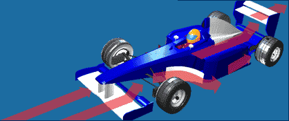 Рис. 2.1 Аэродинамика болида F1. Цель специалиста по аэродинамике - максимально увеличить прижимную силу, при этом сведя к минимуму аэродинамическое торможение. 2.1 Передние и задние антикрылья.С годами сильно увеличились скоростные характеристики болидов F1, увеличилась их способность быстрого прохождения поворотов, и весьма очевидно, что это заслуга так называемых антикрыльев. В начале 60-х годов Формула-1 еще не использовала этих приспособлений, однако уже в 1968 году команды F1 начали экспериментировать с "неуклюжими" и "необработанными" аэродинамическими конструкциями, чтобы получить эффект "прилипания" шасси к трассе. Первые виды таких конструкций были очень простыми и ненадежными, поэтому достаточно часто ломались в процессе гонки. На Рис. 2.2, показаны два вида заднего антикрыла, старого поколения (слева 1968 год) и нынешних технологий (справа 2000 год).