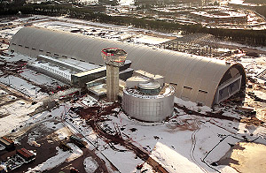 Рис 3.11 Дмитровский автополигон под Москвой. До этого для продувки автомобилей использовались авиационные трубы, но они были не слишком приспособлены. Масштабные модели продувались на кафедре механики МГУ, а на заключительном этапе разработки полноразмерные образцы испытывались в ЦАГИ и на западных автомобильных фирмах Re-nault, Porsche и др. Нет ничего необычного в том, что первым из российских автогигантов своим комплексом аэроклиматических исследований обзавелся АвтоВАЗ. Как было отмечено выше, вазовская труба является практически точной копией поршевской. Но все по порядку. Оказывается, аэродинамикой на ВАЗе занимались практически с самого начала. Существовала даже масштабная модель «копейки» (ВАЗ-2101), которую испытывали в Казанском авиационном институте. Первые целенаправленные аэродинамические опыты ВАЗ начал проводить с 1978 г. на оборудовании ЦАГИ в Москве. Трубы там авиационные и для автомобилей не предназначены (например, там нет пола). Пришлось строить специальные устройства для испытаний моделей автомобилей. Уже в ноябре 1979 г. была проведена первая продувка автомобиля ВАЗ-2108 в натуральную величину. Бытует мнение, что «восьмерку» помогали строить специалисты Porsche. Это утверждение верно лишь отчасти – некоторые консультации были, но не больше. С появлением проекта ВАЗ-2110 возникла острая необходимость в собственной АТ. Многие сотни экспериментов в ЦАГИ не давали практически ничего. Требовалась специальная автомобильная АТ. Окончательная базовая форма «десятки» была утверждена лишь в апреле 1987 г. И в июле 1987 г. после подготовки и многочисленных проверок макетов 1:4 третий вариант масштабной модели автомобиля был испытан в исследовательском центре Вайсах. Там же совместно с сотрудниками Porsche была проведена оптимизация моделей, затем макета масштабом 1:1 и, наконец, автомобиля в натуральную величину. Но этого было недостаточно. Опыт работы на Porsche с особой яркостью выявил необходимость создания своей испытательной базы. И здесь громадную роль сыграл первый президент СССР Михаил Сергеевич Горбачев. Его визит на ВАЗ и знаменитый призыв «стать законодателями мод в автомобилестроении» сослужил хорошую службу. Вскоре после этих событий был проявлен интерес к проблемам ВАЗа, выделено финансирование, и работа закипела. Все начиналось в 1987–1988 гг. Был объявлен конкурс на лучший проект научно-технического центра (НТЦ). Откликнулись многие. Первой была финская фирма «Финстрой», но в итоге победила другая финская компания – «Экке Грен», которая предложила более рациональное строительное решение и нашла партнеров по проектированию и строительству корпусов НТЦ. Для создания комплекса была привлечена канадская фирма DSMA International Inc (именно эта фирма строила аэроклиматические комплексы Porsche и Volvo). Строительные работы начались в 1989 г. Основной корпус был построен уже в 1990 г. Потом начался экономический кризис, и проект несколько замедлился. В 1996 г. начался последний этап строительства. Шел монтаж основного технологического оборудования. Причем сложнейшие аэродинамические весы пришлось монтировать самостоятельно. АТ ВАЗа вступила в строй в 1996 г., и первым автомобилем, который был в ней испытан, стал ВАЗ-1119 «Калина».