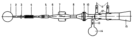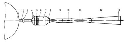 Рис. 3.8 Схема сверхзвуковой баллонной аэродинамической трубы 1 - баллон со сжатым воздухом 2 - трубопровод 3 - регулирующий дроссель 4 - выравнивающие сетки 5 - хонейкомб 6 - детурбулизирующие сетки 7 - форкамера 8 - конфузор 9 - сверхзвуковое сопло 10 - рабочая часть с моделью 11 - сверхзвуковой диффузор 12 - дозвуковой диффузор 13 - выброс в атмосферу