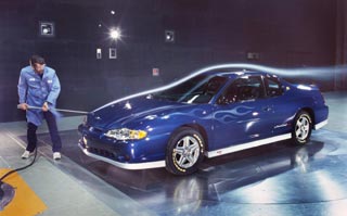 Рис 3.10 Испытания модели болида в аэродинамической трубе Но в виду того, что часто одна и та же деталь модели может быть изготовлена несколько раз с разными модификациями при подгонке параметров модели, становится ясно, что при увеличении размера модели растет и расход материала, усложняется изготовление деталей, а вместе с тем растут и затраты. Поэтому при увеличении размеров моделей разработчикам приходится искать компромиссные решения. Данные о таких параметрах движения модели, как аэродинамическая подъемная сила (отдельно для передней и задней части), сопротивление воздуха и центр аэродинамического давления, постоянно снимаются с модели в реальном времени. Затем эти данные усредняются для каждого из четырех режимов испытаний и анализируются специалистом по аэродинамике. Тот, в свою очередь, делает заключение о том, насколько хорошо ведет себя испытываемая деталь и указывает на возможные проблемы. По результатам анализа данных эта деталь может быть забракована, подвергнута повторному испытанию или доработке. Наряду с конструкторской работой производятся также плановые работы по созданию "аэродинамических карт", на которых фиксируются, например, все подъемные и прижимные силы, действующие на конкретную деталь заднего крыла. Также составляются рекомендации по настройке болида на тот или иной уровень прижимной силы. Все эти данные инженеры берут с собой на Гран При как вспомогательные материалы при настройке аэродинамики болидов. При проведении исследований в аэродинамической трубе очень широко используется пластилин - да, пластилин! Часто идеи, которые приходят в голову исследователям, воплощаются в пластилине, в который в качестве наполнителя добавляют крошку из углеволокна или еще что-нибудь из того, что находится под рукой. Такие модели, хотя и далеки от совершенства, позволяют оценить внешний вид предполагаемого образца и решить, стоит ли тратить средства на построение более качественной модели. Таким образом, экономится время чертежников и конструкторов моделей, поскольку нерабочие варианты дизайна отсекаются на самой ранней стадии. Этот процесс также использовался при создании болида на предстоящий год. В качестве отправной точки при создании нового болида берется модель этого года, а затем в нее вносятся постепенные изменения. В результате модель как бы "эволюционирует". При создании основного каркаса модели использовалось дерево, что давало разработчиками возможность легко вырезать и формировать новые детали модели. А в случае, если модификации оказывались неудачными, у конструкторов всегда оставались образцы первоначальной конструкции. В сезон конструкторских разработок - последнюю четверть года - модель большую часть времени состояла из дерева и пластилина! Когда требовалась более прочная модель (дерево и пластилин коробятся, затрудняя точное копирование модели, а также вызывая нестыковку деталей), по опорным точкам модели делались замеры и строились сечения. Затем эти данные передавались конструкторам, а те, в свою очередь, строили собственно компьютерную модель детали. Теперь процесс производства более автоматизирован, в единицу времени разрабатывается больше деталей, и надобность в пластилиновых моделях и технологии "здесь отрежем, сюда приклеим" отпала. Теперь исключена возможност