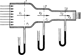 Рис. 1.1 Объяснение закона Бернулли Если через поперечное сечение S1 за одну секунду в трубу входит объем воздуха n1= S1∙ V1, то, очевидно, что через сечение S2 такой же объем n2 = S2∙ V2 воздуха за одну секунду выходит, иначе поток воздуха где-то внутри трубы должен либо разорваться, либо сжаться. Поскольку то и другое невозможно, то сказанное справедливо для любого сечения трубы. Следовательно, n1= n2= n2= const . Иначе говоря, через все сечения трубы за одну секунду проходит одинаковый объем воздуха (закон постоянства секундных объемов) S1∙ V1= S2∙ V2=S3∙ V3= const (1.8) Поскольку поперечные сечения различны (см. Рис. 1.1) S1> S2> S3, то и скорости воздуха в разных сечениях не одинаковы V1< V2< V3. Для измерения давления в рассматриваемых сечениях используются манометры (см. следующий раздел), одна трубка которых соединена с атмосферой. Анализируя показания манометров (см. Рис.1.1), можно сделать заключение, что наименьшее статическое давление (по сравнению с атмосферным) показывает манометр в сечении 3-3. Значит, при сужении трубы (увеличивается скорость воздушного потока) статическое давление падает. Причиной падения статического давления является то, что воздушный поток не производит никакой работы (трение не учитываем) и поэтому полная энергия воздушного потока остается постоянной. Значит, в данном случае возможен только переход кинетической энергии воздушного потока в потенциальную и наоборот. Когда скорость воздушного потока увеличивается, то увеличивается и скоростной напор и соответственно кинетическая энергия данного воздушного потока, а потенциальная энергия (статическое давление) падает Подставим значения из формул (1.3), (1.6) и (1.7), в формулу (1.2), и, учитывая, что энергией положения мы пренебрегаем, преобразуя уравнение (1.2), получим