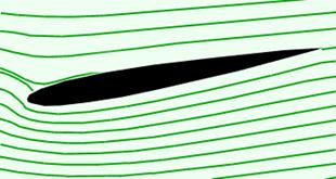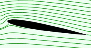 Рис. 1.12 Аэродинамический спектр каплеобразного тела (профиля крыла), помещенного в поток под углом a В результате крыло создает подъемную силу не только потому, что направляет поток вниз, как думают многие (хотя, конечно, подъемная сила и зависит от угла атаки). Все дело в профиле крыла. Форма его сечения такова, что поток воздуха над плоскостью проходит больший путь, чем поток под плоскостью. Поэтому скорость протекания воздуха над крылом и под ним неодинакова — над плоскостью поток течет быстрее, что, согласно закону Бернулли, и создает над крылом зону разрежения и, в конечном итоге, подъемную силу (см. Рис. 1.13).