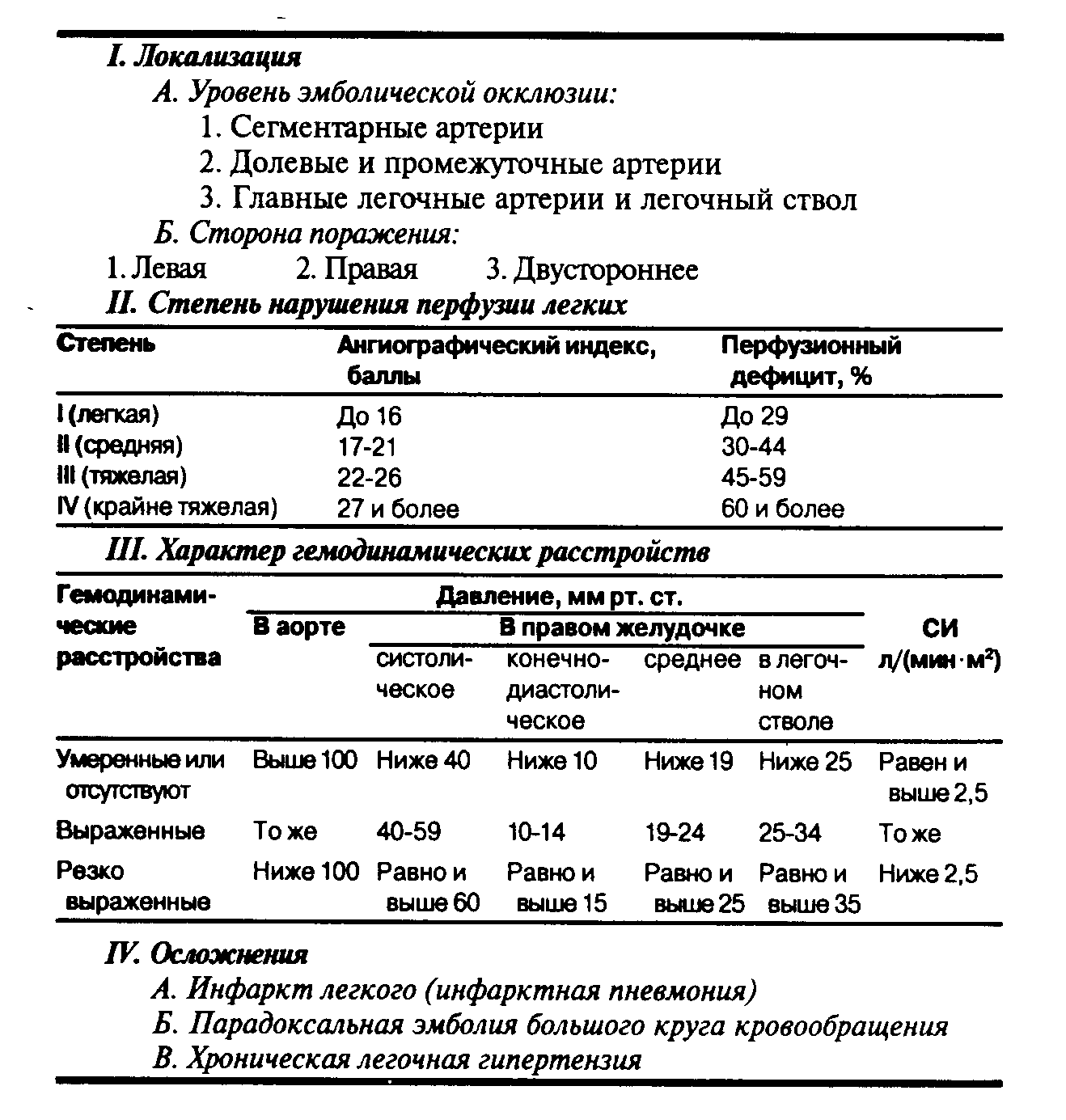 Клиническая картина Наиболее характерным субъективным проявлением заболевания является внезапно возникающая боль за грудиной разнообразного характера. У 42-87% больных наблюдается острая кинжальная боль за грудиной. При эмболии основного ствола легочной артерии возникают рецидивирующие загрудинные боли, обусловленные раздражением нервных аппаратов, заложенных в стенке легочной артерии. В некоторых случаях массивной ТЭЛА резкая боль с широкой иррадиацией напоминает таковую при расслаивающей аневризме аорты. При эмболии мелких ветвей легочной артерии боли могут отсутствовать или быть завуалированы другими клиническими проявлениями. В целом продолжительность боли может варьировать от нескольких минут до нескольких часов. Иногда наблюдаются боли стенокардитического характера, сопровождающиеся ЭКГ - признаками ишемии миокарда в связи с уменьшением коронарного кровотока вследствие снижения ударного и минутного объемов. Определенное значение имеет и повышение АД в полостях правого сердца, что нарушает отток крови по тебезиевым и коронарным венам. Могут наблюдаться резкие боли в правом подреберье, сочетающиеся с парезом кишечника, икотой, симптомами раздражения брюшины, связанные с острым застойным набуханием печени при правожелудочковой недостаточности или развитием массивных инфарктов правого легкого. При развитии в последующие дни инфаркта легкого отмечаются острые боли в грудной клетке, усиливающиеся при дыхании и кашле, они сопровождаются шумом трения плевры. Вторая важнейшая жалоба больных — одышка. Она является отражением синдрома острой дыхательной недостаточности. Характерно внезапное возникновение одышки. Она бывает различной выраженности — от ощущения нехватки воздуха до очень выраженных проявлений. Жалобы на кашель появляются уже на стадии инфаркта легкого, т.е. 2-3 сутки после легочной эмболии; в это время кашель сопровождается болями в грудной клетке и отхождением кровавой мокроты (кровохарканье наблюдается не более, чем у 25-30% больных). Оно обусловлено кровоизлиянием в альвеолы вследствие градиента между низким давлением в легочных артериях дистальнее эмбола и нормальным — в концевых ветвях бронхиальных артерий. Жалобы на головокружение, шум в голове, шум в ушах — обусловлены преходящей гипоксией мозга, при тяжелой степени — отеком мозга. Сердцебиение — характерная жалоба больных с ТЭЛА. Частота сердечных сокращений может быть более 100 в минуту. Общее состояние больного тяжелое. Типичен бледно-пепельный оттенок кожи в сочетании с цианозом слизистых оболочек и ногтевого ложа. При тяжелой массивной эмболии — выраженный чугунный цианоз верхней половины тела. Клинически можно выделить несколько синдромов. 1. Синдром острой дыхательной недостаточности — объективно проявляется одышкой, преимущественно инспираторной, протекает она как «тихая одышка» (не сопровождается шумным дыханием). Ортопноэ, как правило, отсутствует. Даже при выраженной одышке такие больные предпочитают горизонтальное положение. Число дыханий свыше 30-40 в 1 минуту, отмечается цианоз в сочетании с бледностью кожных покровов. При аускультации легких можно определить ослабленное дыхание на пораженной стороне. 2. Умеренный бронхоспастический синдром — выявляется довольно часто и сопровождается сухими свистящими и 