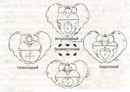 Андроидный таз. Форма входа приближается к треугольной, позадилонный угол узкий, так как передний сегмент узок. Задний сегмент плоский, широкий, большая седалищная выемка узкая, стенки таза сходящиеся, межостный и битуберозный диаметры короткие, лонная дуга узкая. Антропоидный таз. Форма входа продольно-овальная, прямые диаметры таза удлинены, поперечные диаметры укорочены, стенки таза прямые, наклон и кривизна крестца средние, большая седалищная выемка средней величины, лонная дуга несколько сужена. Платипеллоидный таз. Форма входа понеречно-овальная, позадилонный угол широкий, хорошо закругленный, задний сегмент плоский широкий, большая седалищная выемка узкая, стенки таза прямые, длинные поперечные и укороченные прямые диаметры таза, наклон и кривизна крестца средние. Кроме указанных четырех "чистых" форм таза, различают 14 вариантов "смешанных форм". W.E. Caldwell, И.С. Moloy (1933 г) большое значение придают определению переднего и заднего сегментов таза, которые играют важную роль в механизме родов. Плоскость, проходящая через наибольший поперечный диаметр входа таза и задний край седалищных остей, делит таз на передний и задний сегмент. Для разных форм таза величина и форма этих сегментов различна. В современном иностранном руководстве "Williams Obstetrics" (1997 г.) приводится следующая классификация узких тазов: 1 - сужение входа в таз; 2 - сужение полости таза; 3 - сужение выхода таза; 4 - общее сужение таза (комбинация всех сужений). Приведенная классификация крайне сложна для практического применения, так как определить указанные формы сужения таза почти невозможно без использования рентгенпельвиметрии, компьютерной томографии и др. В руководстве "Williams Obstetrics" (1997) вход в таз рассматривают как суженный, если прямой размер меньше 10 см, поперечный меньше 12 см и диагональная коньюгата меньше 11,5 см. Полость таза (узкая часть) при межостном размере менее 10 см рассматривается как подозрение на узкий таз, менее 8 см — как характерная для узкого таза. О сужении выхода таза следует говорить, если межтуберозный размер меньше 8 см. Сужение выхода таза без сужения полости встречается редко. В классификации анатомически узких тазов имеют значение не только особенности строения, но и степень сужения таза, основанная на размерах истинной конъюгаты. При этом принято различать четыре степени сужения таза: первая — истинная конъюгата меньше 11 см и больше 9 см; вторая — меньше 9 см и больше 7,5 см; третья — меньше 7,5 см и больше 6,5 см; четвертая — меньше 6,5 см. Классификация по степени сужения на основании размеров истинной конъюгаты не совсем верна, ибо при уплощении крестца истинная конъюгата может быть нормальной, а полость малого таза резко суженной. Нередко имеет место резкое сужение поперечных размеров таза при нормальной истинной конъюгате. О степени сужения поперечносуженного таза определяют по величине поперечного диаметра плоскости входа в малый таз. Калганова Р.И. ( 1978г. ) выделила 3 степени сужения: 1 степень- 12,5 – 11,5 см 2 степень- 11,4 – 10,5 см 3 степень- менее 10,5 см Чернуха Е.А. ( 1991г. ) выделяет 2 степени сужения: 1 степень- 12,4 – 11,5 см 2 степень- менее 11,4 см В литературе не существует единого определения верхней границы анатомически узкого таза. Большинство авторов считают границей узкого таза: уменьшение наружной конъюгаты до 18-18,5 см, диагональной — до 11 см, ис