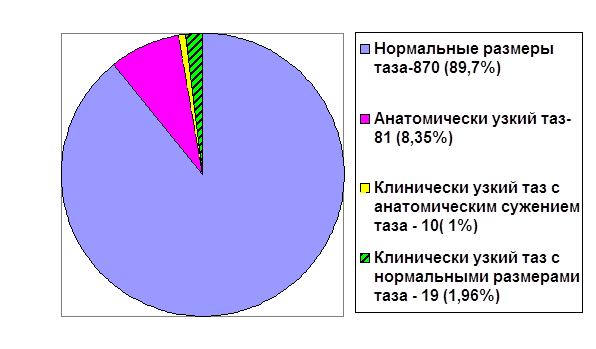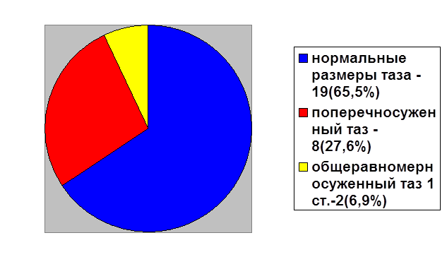 2. По классификации анатомически узкого таза на 1-м месте находится поперечносуженный таз – 58%, что совпадает с литературными данными – 45,2%. На 2-м месте по данным нашего анализа располагается общеравномерносуженный таз – 37%, по данным литературы – 8,5%. На 3-м месте по частоте встречаемости занимает по нашим данным простой плоский таз – 2,47%, по литературным данным – 13,6%.