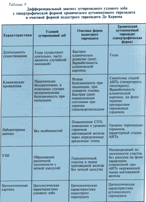 6.Дифференциального диагноза эутироидного узлового зоба с гипертрофической формой, хронического аутоиммунного тиреоидита и очаговой формой подострого тиреоидита Дее Кервена.