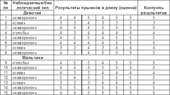Таблица 2. Физическая работоспособность с учетом биологического типа во 2 группе Волнообразный характер изменения работоспособности в процессе уроков связан, как нам кажется, с внутренними биологическими ритмами детей. Следовательно, можно сделать вывод: что основная задача при определении «волн» урока физкультуры — правильный подбор соразмерности параметров «волн» с возможностями учащихся. Также из исследовательской работы видно, что в первой группе лучшие показатели прыжков в длину принадлежат исследуемым с биологическим профилем «жаворонок». Потому что они рано просыпаются и быстро достигают высокого уровня работоспособности в утренние часы, обладая высоким тонусом в первой половине дня и быстрым снижением физиологических показателей в вечернее время. А из этого следует — биологические ритмы оказывают положительное влияние на физическую работоспособность детей среднего школьного возраста, занимающихся в I смену и относящихся к биологическому типу «жаворонок». На детей с биотипом «сова» биологические ритмы оказывают отрицательное воздействие, что также видно из результатов таблицы. Во II смене показатели физической работоспособности выше у детей с биологическим типом «сова», так как они более активны в вечернее время. Из чего следует вывод: существует прямая зависимость между фактором времени суток и биологическим профилем детей, который оказывает позитивное или негативное влияние на физическую работоспособность. И, значит, нужно учитывать в своей преподавательской работе учителям физкультуры и этот фактор тоже. Также, по записям в дневнике наблюдений, можно сделать общий вывод, что при хорошем самочувствии, аппетите, настроении и т.п. физическая работоспособность детей-«жаворонков» в I смене и детей-«сов» во II смене выше среднего. Глава IV Разработка рекомендаций 1. Необходимо так планировать физические нагрузки, чтобы они не превышали определенный уровень и в то же время были стимулом для роста спортивных показателей. В этом случае учитываются 2 основных фактора, взаимодействующие между собой — нагрузка (воздействие) и конкретное функциональное состояние учащегося на данный момент. А, значит, ритм урока физкультуры определяется не только внешними факторами (нагрузкой), но и внутренними биологическими часами. Словом, при определении оптимальной нагрузки на уроке важно учитывать взаимодействие внутренних ритмов (биологических часов) с внешними факторами воздействия. Это следует учитывать учителями физкультуры, тренерам и т.д. и т.п. в организации тренировочного процесса для достижения высоких спортивных результатов. 2. В работе с детьми педагогам необходимо учитывать, что существует прямая зависимость между фактором времени суток и биологическим профилем детей, который оказывает позитивное или негативное влияние на физическую работоспособность. 3. Важно также учитывать и тот факт, что дети с утренним биологическим типом активнее и более работоспособны в утренние часы, поэтому заниматься умственной и физической деятельностью им лучше в первой половине дня, а детям с вечерним биологическим типом — во второй. Выводы 1. Как мы могли убедиться, биологические часы живых организмов, в том числе и человека, проявляются во всех жизненных процессах. Без них невозможна была бы жизнь. Поэтому при изучении 