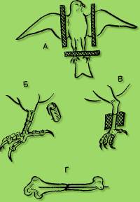 А - фиксация птицы перед операцией; Б - наложение шины на конечности при переломе; В - штифтование трубчатой кости при переломе Операция на крыльях часто проводится ветеринарным врачом на птицах, которых содержат в зоопарках и лесопарках. Ограничение летательной функции основывается на том, чтобы при операции вызвать асимметрию крыла. При этом птица не в состоянии подняться в воздух или держаться во время полета, если оперировать оба крыла, то этот эффект может пропасть. Асимметрия крыльев проводится бескровно или кровавым методом. Бескровный способ дает временный эффект. и заключается в том, что у птицы вырезают ножницами 8-10 маховых перьев крыла. Эти перья выпадают и полностью отрастают в последующие 2-3 месяца. В дальнейшем необходимо проводить повторную операцию по удалению пера (рис. 17). Операционный метод. Из различных способов этого типа применяют тенотомию, нервоэтомию, ампутацию кости. Наибольший интерес представляет последний метод, который дает самые надежные результаты. Если раскрыть крыло птицы, то в передней его части видно маленькое образование из перьев, которое служит ориентиром при операции. Для операции каудально делают разрез между большими метакарпальными костями. Чтобы препятствовать сильному кровотечению, накладывают двойную лигатуру. Две нити, продетые через отверстие между обеими метакарпальными костями, стягивают, в результате птица не в состоянии полностью открыть крыло. При этом следует заботиться, чтобы большой палец крыла оставался свободным. Он играет очень важную роль в опорной функции. Если его удалить, то у птицы отвисает крыло. Наиболее безопасна и легко переносится операция в возрасте 30-50 дней. У взрослых птиц, несмотря на наложение лигатуры на обе кости, иногда возникают геморрагии. Локальная анестезия может образоваться при введении под кожу пальца крыла наркотических препаратов.