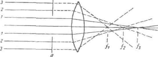 Рис. 11 Схема сферической аберрации. Центральные лучи 1-1 собираются в фокусе f3 лежащем на сетчатке: краевые лучи 2-2 и 3-3 собираются в фокусах f2 и f1, лежащих перед сетчаткой. Вертикальные линии А-А перед хрусталиком изображают радужную оболочку, не пропускающую краевых лучей, что способствует четкости изображения. через оптическую ось, и лучей, проходящих через периферические части хрусталика, различается. Это обуславливает появление на сетчатке размытого изображения. Частичной компенсацией этого явления может быть отсекание периферических лучей, падающих на хрусталик. В этом случае четкость изображения увеличивается. Это и происходит при сужении зрачка. Третья причина несовершенств оптической системы глаза вызвана следующим. Простые линзы преломляют свет разной длины волн неодинаково. Свет с более короткой длиной волны в пределах видимой части спектра преломляется больше, чем с более длинной. Это явление было названо хроматической аберрацией. Следующий дефект зрения связан с нарушением процессов аккомодации. Под аккомодацией понимается приспособление глаза к видению разноудаленных предметов. Механизм аккомодации заключается в следующем. Изменение кривизны хрусталика вызывается сокращением ресничных мышц, которые изменяют выпуклость хрусталика. Хрусталик находится в капсуле, которая прикреплена к связкам, в свою очередь, связанным с ресничным телом. Связки всегда натянуты, и их натяжение передается капсуле, сжимающей и уплотняющей хрусталик. В ресничном теле находятся гладкие мы-