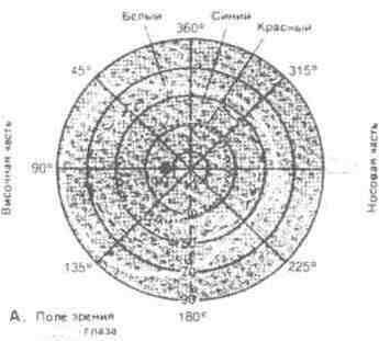 Рис. 12 Схема рефракции в дальнозорком (1), нормальном (2) и близоруком (3) глазу щечные волокна. При их сокращении тяга связок ослабляется, а значит, уменьшается давление на хрусталик, который вследствие своей эластичности принимает более выпуклую форму. Сокращение мышц регулируется парасимпатической и симпатической частями вегетативной нервной системы. Нарушение преломления лучей выступает в двух формах - близорукости (миопии) и дальнозоркости (гиперметропии). Близорукость может быть обусловлена или большой длиной глазного яблока, или повышенной преломляющей способностью хрусталика. В этом случае главный фокус преломления будет располагаться не на сетчатке, а перед ней. Дальнозоркость объясняется или уменьшением преломляющей силы хрусталика, или уменьшением величины глазного яблока. В этих случаях фокус будет находиться за сетчаткой. Помимо перечисленных выше дефектов оптической системы глаза могут происходить изменения внутреннего состава хрусталика и стекловидного тела, ведущие к их помутнению. Поэтому при преломлении света наблюдается его диффузное рассеивание. При рассмотрении белого фона поверхности человек видит мелькающие кружочки, точки и т. д. 2.4 Зрительное восприятие 2.4.1 Поля зрения Если фиксировать глазом какую-либо точку, ее изображение падает на желтое пятно. И в этом случае мы видим точку центральным зрением. Точки, изображение которых падает на остальные области сетчатки, видимы периферическим зрением. Совокупность точек, одновременно видимых глазом при фиксации взгляда в одной точке, называют полем зрения. Измерение границы поля периферического зрения производят прибором, называемым периметром. Граница поля зрения для бесцветных предметов составляет книзу 70", кверху - 60° и кнаружи - 90°. Поля зрения для различных цветов неодинаковы, больше всего они для бесцветных предметов. Рис.13Схема аппарата для периметрии. Поле зрения оценивается монокулярно. Испытуемый располагается перед аппаратом таким образом, что его глаз совпадает с центром полусферы и фиксирует взглядом точку на ее полюсе (Ф). Врач проверяет правильность фиксации через специальное отверстие и перемещает световое пятно по поверхности сферы прибора с помощью проекционной системы, управляемой ручкой Р. Световое пятно может иметь разную величину, яркость и цвет. Как только испытуемый замечает пятно, он подает сигнал, и это положение пятна регистрируется на бумаге, закрепленной на подставке П. А Результат определения границ нормального поля зрения для белого, синего и красного стимулов. СП - слепое пятно. Точка фиксации соответствует центру концентрических кругов, обозначающих удаленность стимула от точки фиксации (в угловых градусах).