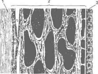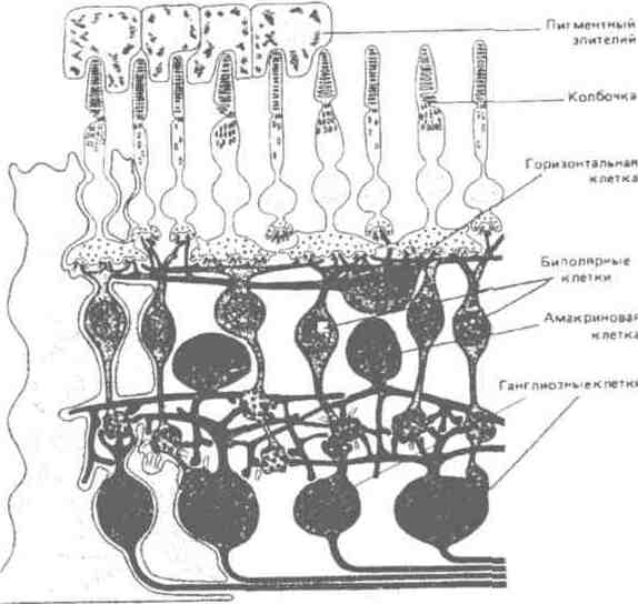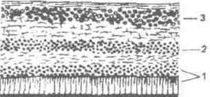 1 - фоточувствительный слой. Состоит из тел фоторецепторов: 2 - промежуточный слой. Он состоит из тел биполярных и амакриновых нейронов;3 - внутренний слой. Образован ганглиозными клеткам. биполярные нейроны, которые связывают фоторецепторы с клетками третьего слоя. Третий, внутренний, слой образован ганглиозными клетками, дендриты которых соединены с биполярными клетками, а аксоны образуют зрительный нерв.