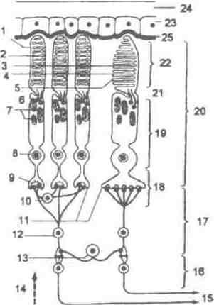 Рис.15 Строение сетчатки. 1 - палочка, 2 - мембранные диски, 3 - колбочка; 4 - складки; 5 -плазматическая мембрана; 6 - пара ресничек; 7 - митохондрии; 8 - ядро;9 - концевое утолщение: 10 -горизонтальная клетка: 11 -синаптические окончания: 12 -биполярная клетка; 13 амакриновая клетка; 14 -направление лучей света; 15 -нейроны зрительного нерва; 16 -внутренний поверхностный слой: 17 - промежуточный слой; 18 -синаптический участок; 19 -внутренний сегмент, 20 - слой фоторецепторов; 21 - сужение: 22 - наружный сегмент; 23 - эпителий сосудистой оболочки; 24 - склера; 25 - пигментный слой. 2.5.2 Фоторецепторы У человека слой рецепторов сетчатки состоит примерно из 120 млн. палочек и 6 млн. колбочек. Палочки и колбочки выполняют разные функции. Палочки осуществляют темновое видение, колбочки - цветовое. Более чувствительны к свету палочки. Они обеспечивают зрение при слабом освещении. Несмотря на различные функции, палочки и колбочки сходны по своему строению. Фоторецептор состоит из 4 участков: наружный сегмент, перетяжка, внутренний сегмент, синоптическая область. Наружный сегмент. Это светочувствительный участок, где световая энергия преобразуется в рецепторный потенциал. Весь наружный сегмент заполнен мембранными дисками, образованными плазматической мембраной и отделившимися от нее. В палочках число этих дисков составляет 600-1000, и они представляют собой уплощенные мембранные мешочки, уложенные наподобие стопки монет. В колбочках мембранных дисков меньше, и они представляют собой складки плазматической мембраны. Образование мембранных дисков или складок плазматической мембраны увеличивает площадь фоторецептивной поверхности мембраны и позволяет увеличить общее количество молекул зрительного пигмента в них.
