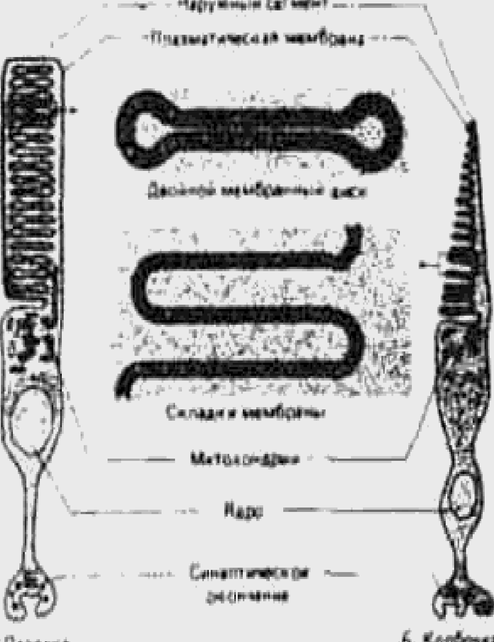 Рис.16 Структура мембранного диска наружных сегментов палочек и мембранных складок наружных сегментов колбочек. Следовательно, повышается вероятность поглощения фотонов света. Компактное расположение таких структурных единиц стопкой на пути светового луча увеличивает коэффициент поглощения фоторецептора, что ведет к повышению его абсолютной чувствительности. Перетяжка. В этой области наружный сегмент почти полностью отделен от внутреннего впячиванием наружной мембраны. Связь между сегментами осуществляется через цитоплазму и пару ресничек, переходящих из одного сегмента в другой. Внутренний сегмент. Здесь происходят интенсивные обменные процессы. Наблюдается большое количество митохондрий, образующих энергию для процессов зрения, и полирибосом, на которых синтезируются белки, участвующие в образовании мембранных дисков и зрительного пигмента. В этом же участке расположено ядро клетки. Синоптическая область. В этом участке клетки образуются синапсы с биполярными нервными клетками, к которым поступают импульсы от нескольких фоторецепторов, т.е. происходит суммирование возбуждения от нескольких фоторецепторов на биполярной клетке. Этот процесс называют конвергенцией. Это уменьшает остроту зрения, но повышает светочувствительность. В случае связи одной колбочки с одной биполярной и одной ганглиозной клеткой обеспечивается большая острота зрения. 2.5.3 Фотохимические реакции Фотохимические процессы в принципе одинаковы у всех животных, как у беспозвоночных, так и у позвоночных. В палочках у человека содержится пигмент родопсин, а в колбочках - иодопсин. Родопсин представляет сложную молекулу, состоящую из липопротеина и ретиналя - альдегидной формы витамина А. При действии света происходит цикл фотохимических реакций, ведущих к расщеплению родопсина. Вслед за фотохимическими процессами происходят биоэлектрические изменения рецепторного потенциала, и далее возбуждение через биполярные нервные клетки переходит к ганглионарным клеткам, и по зрительному нерву достигает центральной нервной системы. В темноте происходит ресинтез родопсина. Процесс обновления наружных сегментов палочек осуществляется постепенно. Например, у некоторых обезьян - макак и резусов - каждая палочка обновляется за 9-12 дней. Эту функцию обновления, а также хранения витамина А и его производных выполняют пигментные клетки. Глаз предохраняет себя от избыточной освещенности путем изменения величины зрачка. Помимо этого сама сетчатка способна компенсировать увеличение яркости: существуют колбочки и палочки, функционирующие в разных диапазонах яркости, происходит перестройка рецептивных областей. Если на сетчатку попадает мало света, то синтез родопсина интенсифицируется, и концентрация родопсина увеличивается. Это фотохимическая основа темновой адаптации глаза. Одновременно зрение переходит на палочковую систему с помощью горизонтальных клеток и рецептивные поля этих нейронов увеличиваются. Также размер зрачка увеличивается. 2.5.4 Промежуточный слой Промежуточный слой сетчатки содержит как биполярные, так и горизонтальные и апокриновые клетки. Биполярные клетки имеют входы от рецепторов, и часть их передает сигналы непосредственно к ганглиозным клеткам. Кроме такой прямой передачи импульсов в ганглиозные клетки существ