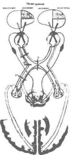 Рис.17 Структура сетчатки Падающий свет Таким образом, импульсы от фоторецепторов далее подходят к биполярным клеткам. Каждая такая клетка связана с несколькими палочками и колбочками. В свою очередь, одна ганглиозная клетка контактирует со многими биполярными клетками. Фоторецепторы, соединенные с одной ганглиозной клеткой, образуют рецептивное поле ганглиозной клетки. Причем, рецептивные поля ганглиозных клеток перекрывают друг друга, что связано с наличием горизонтальных и амакриновых клеток, соединяющих по горизонтали биполярные и ганглиозные клетки. Поэтому одна ганглиозная клетка может быть связана с десятками тысяч фоторецепторов. В сетчатке есть центробежные нервные волокна, которые могут регулировать количество нейронов, охваченных возбужден. В мозге человека аксоны от левых половин сетчатки обеих глаз направляются к левой половине зрительной коры, а аксоны от правых половин сетчатки обеих глаз - к правой стороне зрительной коры. Аксоны, идущие от носовых половин обеих сетчаток, пересекаются. Место их пересечения называют зрительным перекрестом или хиозмой. После пересечения образуется зрительный тракт, который проходит через коленчатые тела, четверохолмие и другие мозговые структуры и поступает в корковый конец зрительного анализатора. Перекрещиваются только внутренние волокна, начинающиеся от медиальной (носовой) половины сетчатки. Наружные или височные волокна проходят через плазму не перекрещенными. Каждый зрительный тракт содержит волокна от внутренней половины сетчатки глаза противоположной стороны и наружной половины сетчатки глаза своей стороны. Таким образом, зрительный тракт содержит волокна от одноименных половин сетчатки обоих глаз - левых и правых. Следовательно, правый зрительный тракт проводит раздражение от левых половин полей зрения обоих глаз, а левый - правых. Поля зрения Височная носовая носовая височная