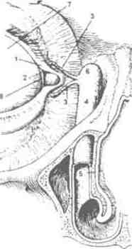 2-выводные канальцы. 3-медиальный угол глаза.