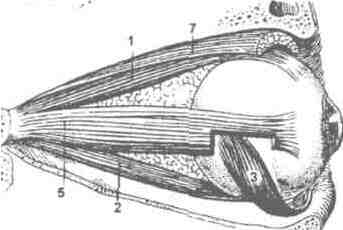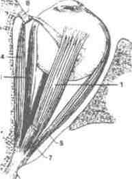 Рис. 6 Мышцы глазного яблока: А - вид сбоку, Б - вид сверху. 1 - прямая верхняя мышца; 2 - прямая нижняя мышца; 3 - нижняя косая мышца: 4 - верхняя косая мышца; 5 - прямая наружная мышца; 6 -прямая внутренняя мышца; 7 - мышца, поднимающая верхнее веко, 8 - блок фиброзно-хрящевой петли