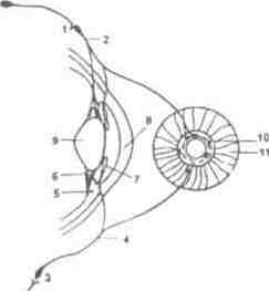 Рис. 8. Схема иннервации радужной оболочки и ресничной мышцы. 1 - ресничный ганглий, (цилиарный): 2 -короткие ресничные нервы; 3 - верхний шейный симпатический ганглий; 4 -симпатические нервы, (цилиарная); 5 -ресничная мышца 6 - волокна капсулы хрусталика: 7 - радужная оболочка: 8 -роговая оболочка.9 – хрусталик. 10 -кольцевая мускулатура радужной оболочки.11 - радиальная мускулатура радужной оболочки. В радужной оболочке имеется два вида мышечных волокон, окружающих зрачок: кольцевые, иннервируемые парасимпатическими волокнами глазодвигательного нерва, к которым подходят нервы от ресничного узла. Радиальные мышцы иннервируются симпатическими нервами, отходящими от верхнего шейного симпатического узла. Сокращение первых вызывает сужение зрачка (миоз), а сокращение вторых - расширение (мидриаз). Диаметр зрачка и зрачковые реакции - важные диагностические признаки при повреждении мозга. 2.3 Светопреломляющий аппарат глаза Глаз представляет собой сложную оптическую систему линз, которые образуют на сетчатке перевернутое и уменьшенное изображение внешнего мира. Диоптрический аппарат состоит из прозрачной роговицы, передней и задней камер, заполненных водянистой волной, радужной оболочки, окружающей зрачок, хрусталика и стекловидного тела. Преломляющая сила глаза зависит от радиуса кривизны роговицы, передней и задней поверхности хрусталика, от показателей преломления воздуха, роговицы, водянистой влаги, хрусталика, стекловидного тела. Знание этих показателей, а также некоторых дополнительных сведений позволило по специальным формулам рассчитать общую преломляющую силу диоптрического аппарата глаза. Она равна для глаза 58.6 диоптрий. Преломляющая сила измеряется уравнением 1/f, где f- фокусное расстояние. Если оно задано в метрах, единицей преломляющей (оптической) силы, будет диоптрия. Само же фокусное расстояние