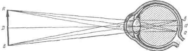 Рис. 9. Построение изображения. АВ – предмет; аб - его изображение; 0 - узловая точка. позади линзы зависит от разницы показателей преломления на границе двух поверхностей раздела и от радиуса кривизны раздела этих сред. Основными преломляющими средами являются роговица и хрусталик. Хрусталик заключен в капсулу, которая прикреплена циановыми связками к ресничному телу. Благодаря сокращению ресничных мышц меняется кривизна хрусталика. 4