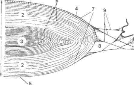 Рис. 3 Схематический разрез глазного яблока. 1 - роговица: 2 - передняя камера; 3 - задняя камера: 4 - радужка; 5 - хрусталик: 6 - ресничная мышца: 7 - склера: 8 - сосудистая оболочка; 9 - сетчатка; 10 - стекловидное тело: 11 - сосок зрительного нерва: 12 - мышца века; 13 -конъюктива: 14 - хрящ нижнего века: 15 - железы хряща века; 16- мышца, однимающая верхнее веко: 17-ресницы: 18 - жировое тело глазницы; 19 -верхний конъюктивальный мешок. Расположение отдельных частей глаза почти всегда неизменно. Такая устойчивость поддерживается как жесткой склерой, так и постоянным уровнем внутриглазного давления. Водянистая влага передней камеры глаза образуется благодаря процессу фильтрации из кровеносных капилляров цилиарного тела. Фильтрат поступает в заднюю камеру глаза - пространство между радужной оболочкой и хрусталиком, и из него жидкость переходит в переднюю камеру. По краю камеры в месте соединения радужной оболочки и роговицы водянистая влага поступает в слезовой канал и венозную систему. Внутриглазное давление сохраняется постоянным, если количество выводимой через шлемов канал жидкости точно соответствует количеству жидкости, образующейся в цилиарном теле. Если же отток затруднен, то повышается внутриглазное давление, и возникает глаукома. Рис. 4 Микроскопическое строение роговицы 1-передний эпителий. Пятислойный плоский неороговевающий эпителий покрывает переднюю поверхность роговицы и делает ее Идеально ровной. 2- базальная мембрана перед- него эпителия; 3 – собственное вещество. Оно не имеет сосудов и сос - тоит из накладывающихся пластинок коллагеновых во- локон. Степень набухания во- локон определяет прозрачность роговицы; 4 – базальная мембрана заднего роговичного эпителия 5 – однослойный плоский эпителий, покрывающий заднюю поверхность роговицы. Под склерой находится сосудистая оболочка и кровеносные сосуды, которые питают сетчатку Сосудистая оболочка переходит в ресничное или цилиарное тело, в котором находятся гладкие мышечные волокна, образующие ресничную мышцу.