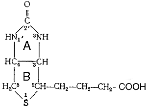 Молекула биотина состоит из имидазолового (А) и тиофенового (В) колец. Гетероцикл можно рассматривать как тиофеновое кольцо, связанное с уреидной группировкой. Приведенная структура биотина была подтверждена полным его химическим синтезом. В молекуле имеется три асимметрических атома углерода, что обусловливает существование 8 стереоизомеров. Биотин образует игольчатые кристаллы с температурой плавления 232°. D поперечном сечении кристалл представляет собой ромб, острые углы которого равны 55°. Длина осей: а—5,25Ǻ, b—10,35Ǻ, с— 21,00Ǻ. Плотность кристаллов 1,41. Молекулярный вес биотина на основе химической формулы равен 214. Нa на основе рентгеноскопического анализа 245±6. При исследовании кристаллической структуры биотина установлено, что алифатическая цепь находится в цис-положении по отношению к уреидной циклической группировке.