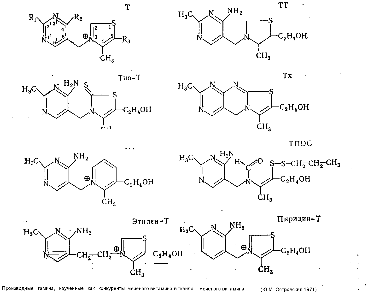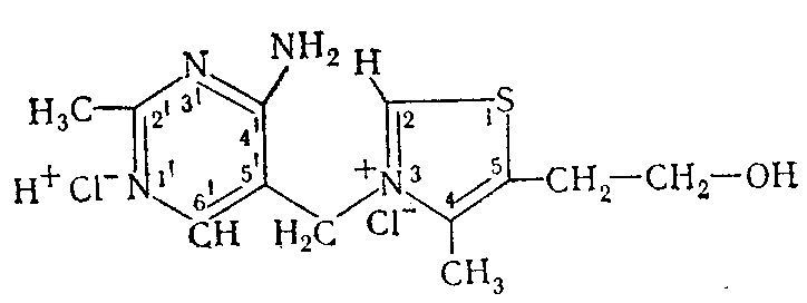 Первые упоминания о заболевании (какке, бери-бери), известном сейчас как проявление недостаточности тиамина, встречаются в древних медицинских трактатах, дошедших до нас из Китая, Индии, Японии (Bicknell, Prescott, 1953; Inouye, Katsura, 1965). К концу прошлого столетия клинически уже различали несколько форм этой патологии, но только Takaki (1887) связал заболевание с какой-то, как он тогда полагал, недостаточностью азотсодержащих веществ в пищевом рационе. Более определенные представления были у голландского врача С. Eijkman (1893—1896), обнаружившего в рисовых отрубях и в некоторых бобовых растениях неизвестные тогда факторы, предупреждавшие развитие или излечивавшие бери-бери. Очисткой этих веществ занимались затем Funk (1924), впервые предложивший сам термин «витамин», и ряд других исследователей (Wuest, 1962). Извлеченное из естественных источников активное вещество только в 1932 г. было охарактеризовано общей эмпирической формулой, а затем (1936) успешно синтезировано. Еще в 1932 г. высказывалось предположение о роли витамина в одном из конкретных процессов обмена веществ—декарбоксилировании пировиноградной кислоты, но лишь в 1937 г. (Lohman, Schuster) стала известна коферментная форма витамина—тиаминдифос-фат (ТДФ). Коферментные функции ТДФ в системе декарбоксилирования ct-кето-кислот долгое время представлялись почти единственными биохимическими механизмами реализации биологической активности витамина, однако уже в 1953 г. круг ферментов, зависящих от присутствия ТДФ, был расширен за счет транскетолазы, а совсем недавно и специфической декарбоксилазы γ-окси-α-кетоглютаровой кислоты. Нет оснований думать, что перечисленным исчерпывается перспектива дальнейшего изучения витамина, так как эксперименты на животных, данные, получаемые в клинике при лечебном применении витамина, анализ фактов, иллюстрирующих известную нейро- и кардиотропность тиамина, с несомненностью указывает на наличие еще каких-то специфических связей витамина с другими биохимическими и физиологическими механизмами (В. Б. Спиричев, 1966; Ю. М. Островский, 1971). 2. Химические и физические свойства витамина В1 Тиамин (В. М. Березовский, 1959; В. А. Девятнин, 1964), или 4-метил-5-β-оксиэтил-N- (2-метил-4-амино-5-метилпиримидил) -тиазолий, получается синтетически обычно в виде хлористо-или бромистоводородной соли:
