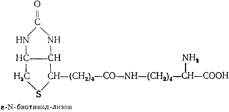 антагонистом витамина для L. casei, E. coli и Neurospora. Известны аминокислотные производные биотина, среди которых наиболее изучен биоцитин, обладающий высокой активностью для многих микроорганизмов. Биоцитии выделен в кристаллическом виде из дрожжей. В 1951 г. расшифрована его структура. Оп представляет собой пептид биотина и лизина, а именно: